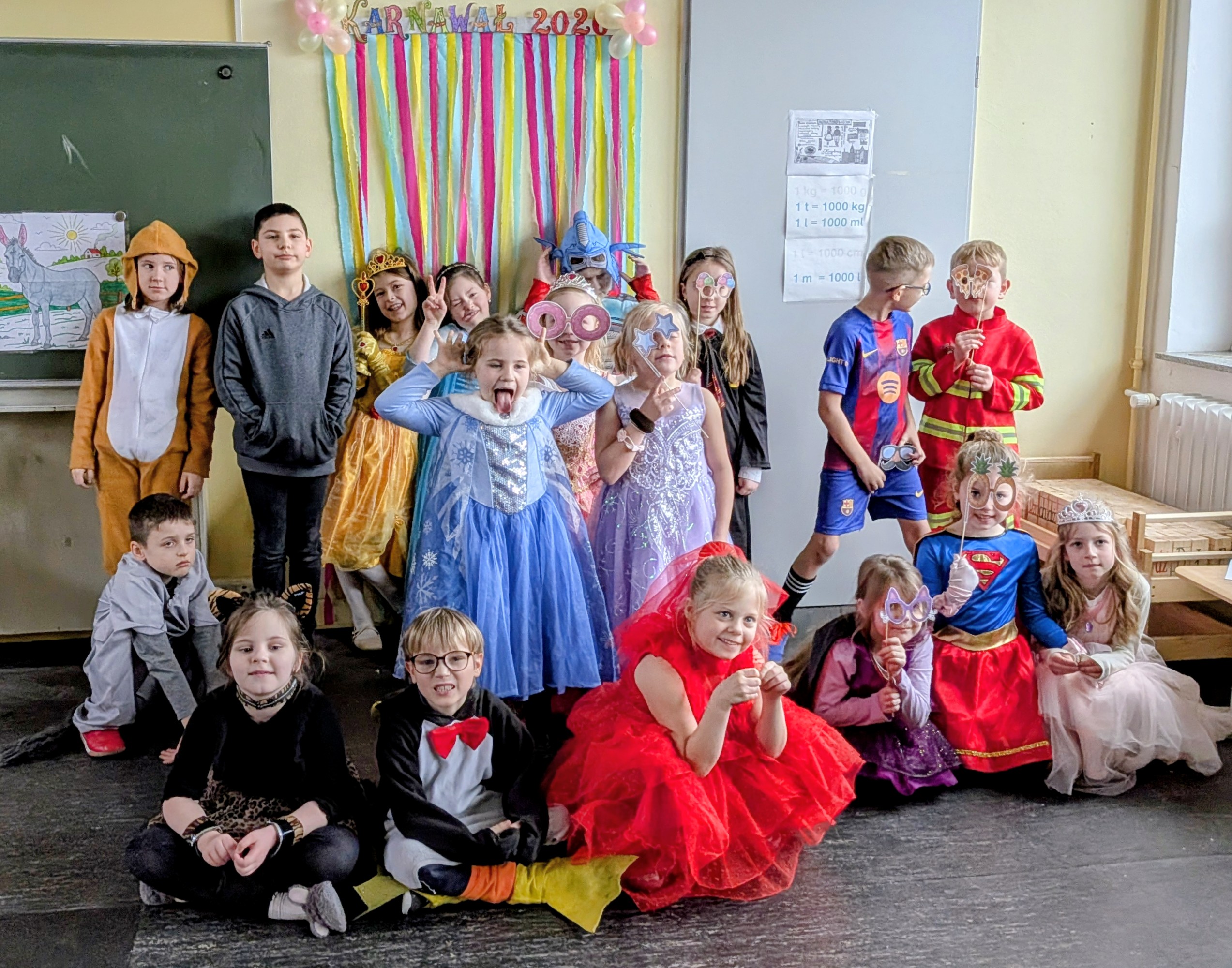 Czternastego lutego, w sobotnią porę, Wielki bal opanował naszą Polską Szkołę! Klasa pierwsza i druga w stroje wskoczyły, Jako stwory i postacie z bajek ożyły. Muzyka grała, nóżki tupały, Lecz to nie tylko tańce nas grzały! Były „gorące krzesła” i wyzwań bez liku, Przypinaliśmy ogon osiołkowi w kąciku. Hula-hop wirowało, balony latały, A śmieszne zdjęcia